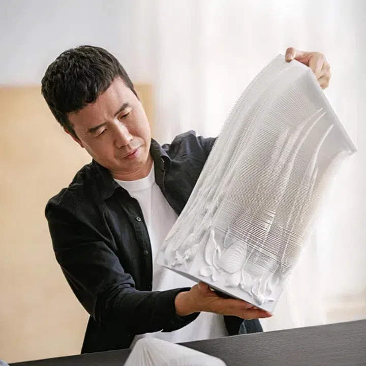 Chinese artist Li Hongbo (pictured right) worked with French luxury beauty brand Guerlain to incorporate his intricate paper sculptures in a limited edition version of the brand’s best-selling Orchidee Imperiale Black The Cream.