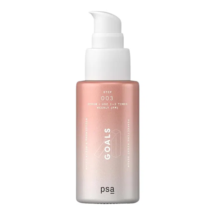 Best Serum For Uneven Skin Tone: PSA Goals Multi Acids & Probiotics Perfecting Night Serum, $72