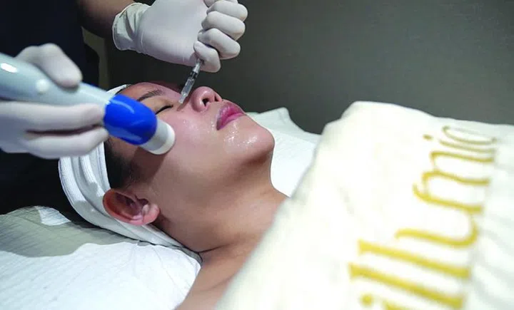 Electromagnetic waves help skincare ingredients penetrate deep into skin. After cleaning, an exfoliation peel and extraction, the snazzily named Meso Infinity Thermal Electroporation Mesochip Mesotherapy Device uses electromagnetic waves to deliver either hyaluronic acid or collagen serum into the skin. Our tester found it painless and shared that her skin looked very nourished and plump afterwards.