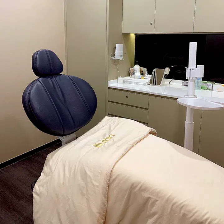 The treatment is designed to push collagen-stimulating ingredients into the skin, including peptides, vitamin B9, and acetylated glutamine. Ambience wise, expect a squeaky-clean medi-spa, with therapists in hairnets and coveralls.