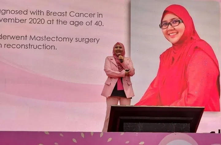 Cancer warrior Aisha Jiffry sharing her story at an event and encouraging others to go for their breast screening. PHOTO: COURTESY OF AISHA JIFFRY