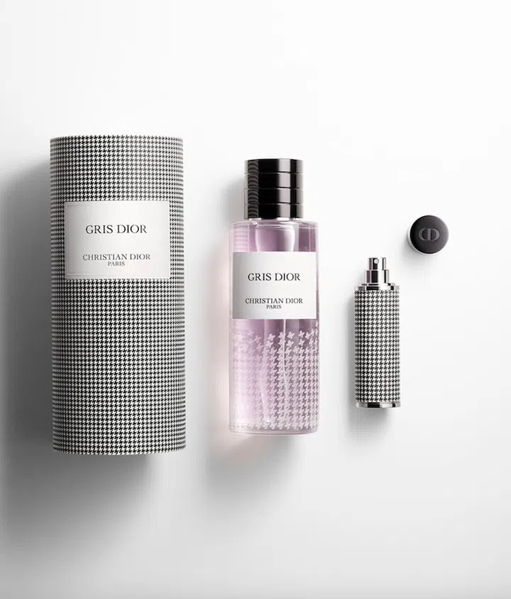 In Dior Beauty’s New Look collection, a toile fabric with the houndstooth pattern wraps the presentation boxes, and appears on the glass bottles of Gris Dior, Jasmin des Anges and Lucky. There’s also a travel spray that gets the same treatment, making for a very chic portable perfume item.