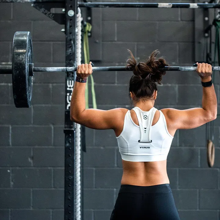 Grip the barbell with your hands at shoulder-width and lift it off its resting place. Lower the weight to your chest, engage your core, and lift the barbell above your head. At this point, your arms should be straight. Keep your core engaged as you hold this position for ten seconds.