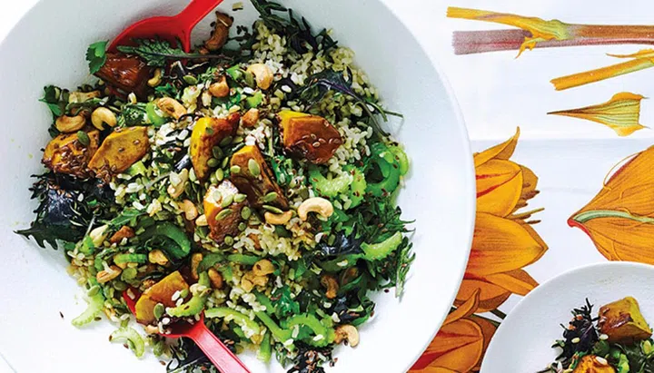 Wholesome brown rice pairs fantastically with fragrant Japanese pumpkin in this nutritious salad that also contains lots of seeds and greens.