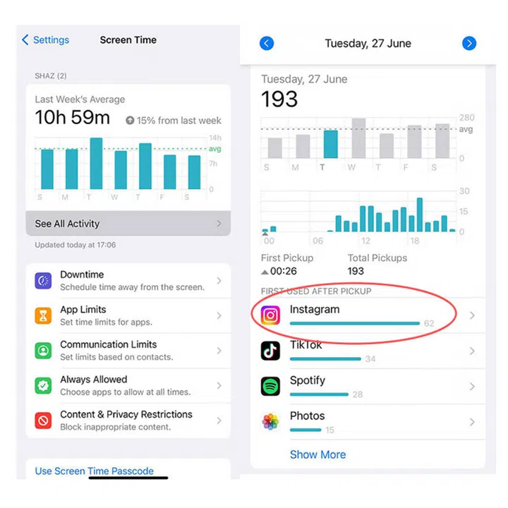 Pull out your phone, and under ‘Settings’, go to ‘Screen Time’ to see all your activity. Under the ‘First Used After Pickup’, have a look at the number of times you’ve opened the apps on your phone. Doing so allows you to have an insight on how often you wake your devices and which apps you use first after waking them. If you’re heavily reliant on social media, you’ll notice that most of these apps will be at the top of your list. For someone like me, whose work revolves around all things digital, you can definitely tell that I spend most of my time scrolling through apps like TikTok and Instagram.