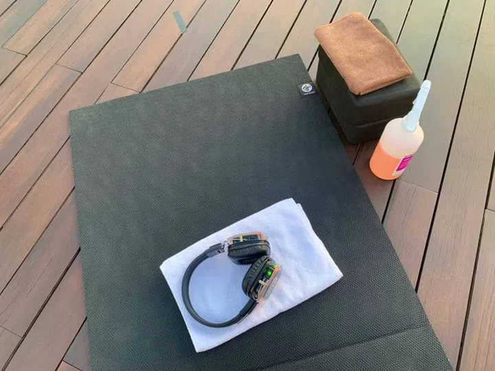 The yoga mats were already laid out when we got there, so all we had to do was pick a spot we liked. There were also two yoga blocks, two small towels, and a bottle of disinfectant spray provided at each mat.