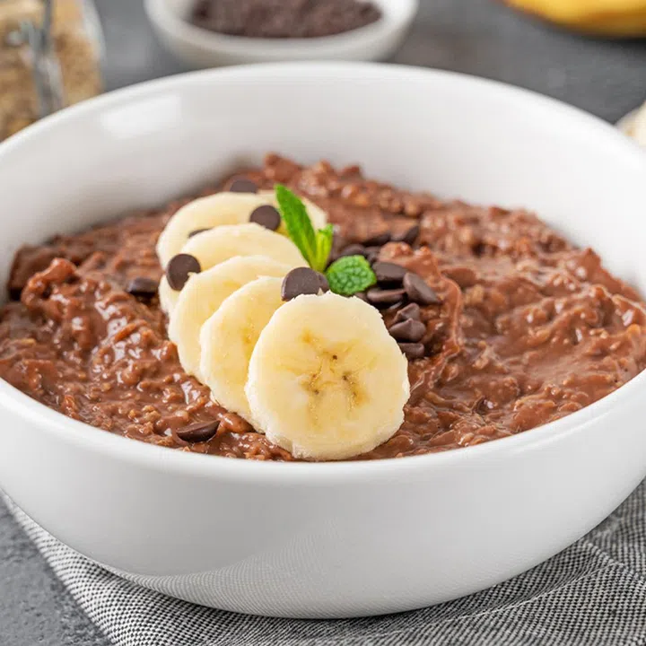 Oatmeal is rich in fiber and doesn’t take long to make. Fiber slows down digestion and takes up space in your stomach since your body can’t break it down. Oatmeal is an excellent fiber source; adding walnuts adds more fiber to the meal and some protein and healthy fats.