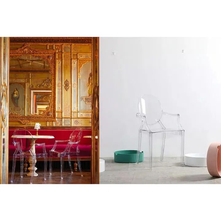 The Ghost Chair is famous for many reasons – it’s made entirely from a single mould, it’s a plastic rendering of an extremely classic French chair, it’s versatile and suitable for both indoors and outdoor, it’s collision proof, and stackable.