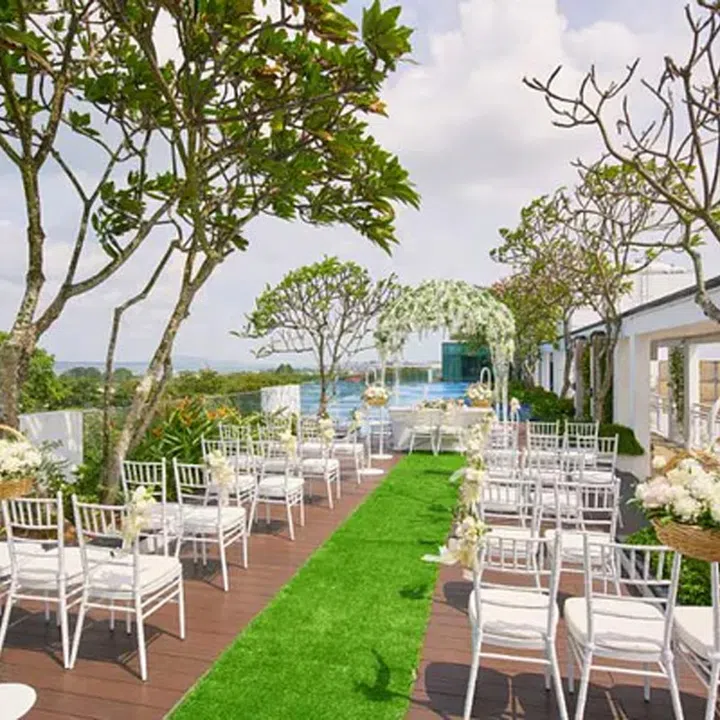Besides its wedding packages at the Glass Pavilion and the Grand Ballroom, the resort also offers several beautiful outdoor venues with scenic views of the sea and greenery that surrounds it, like its Sky Pool for breezy solemnisations.