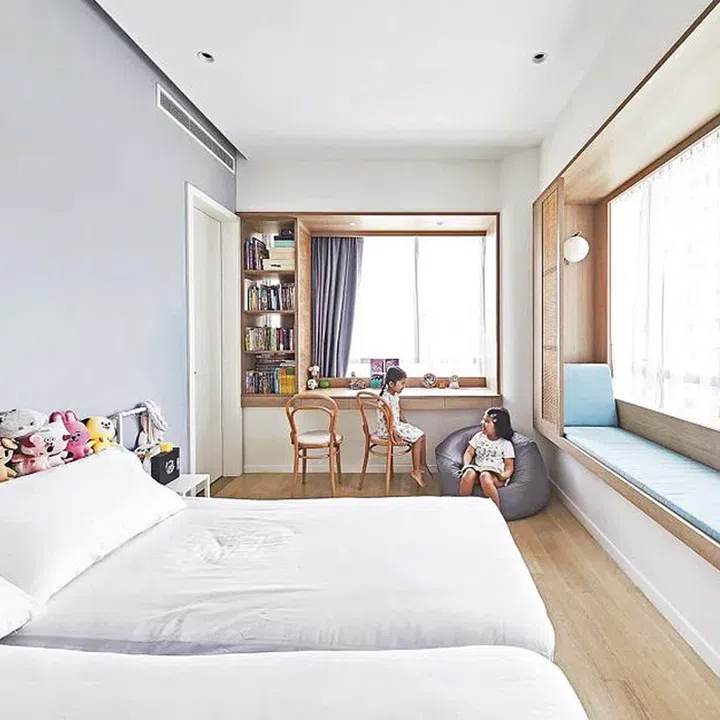 Children are space explorers, and a variety of spaces in their room does wonders to inspire them. Consider building up with bunk beds, or diversify the sitting options with a bay window reading nook or bean bags, as seen in this shared children’s room by Ehka Studio.