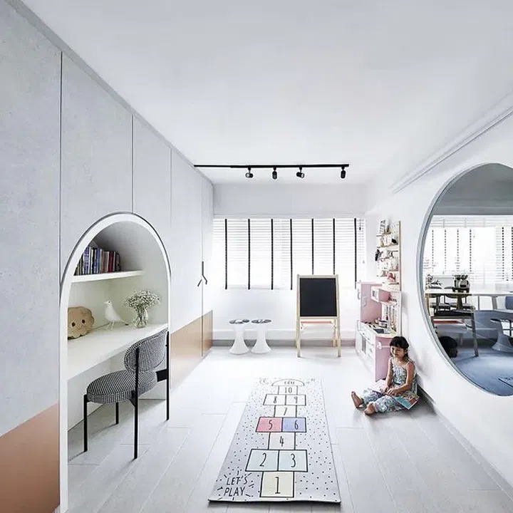 Children’s needs evolve quickly, so think about what they need in the near, and not-so-near future, and plan accordingly. This multifunctional room designed by Wolf Woof is reserved for the family’s granddaughter, who is currently sharing a bedroom with her mother but will need her own room in a few years. When the time comes, a bed will be added under the arch niche while the study will be moved near the window.