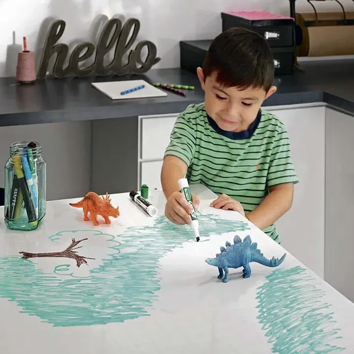 Children doodle and scrawl, it is known. So why not facilitate this with a writable surface. Having a dedicated scrawl wall will not only allow them to be creative but will also contain the visual clutter. This writable surface from Formica is a wonderful option.