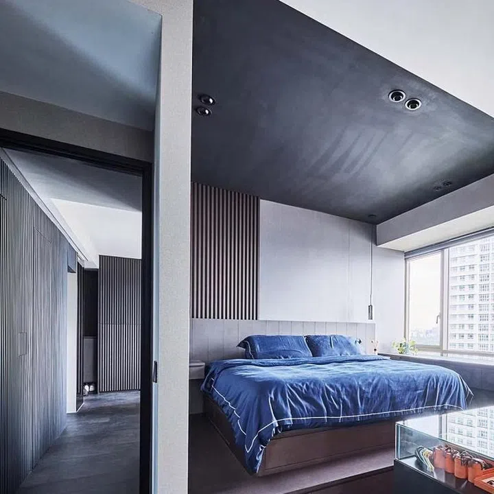The master bedroom continues the dark and moody theme with black wallpaper and a black ceiling. With two bedrooms-in-one, there is space for a sleeping area, as well as a walk-in wardrobe. The bed is elevated on a platform, with storage drawers built into the steps.