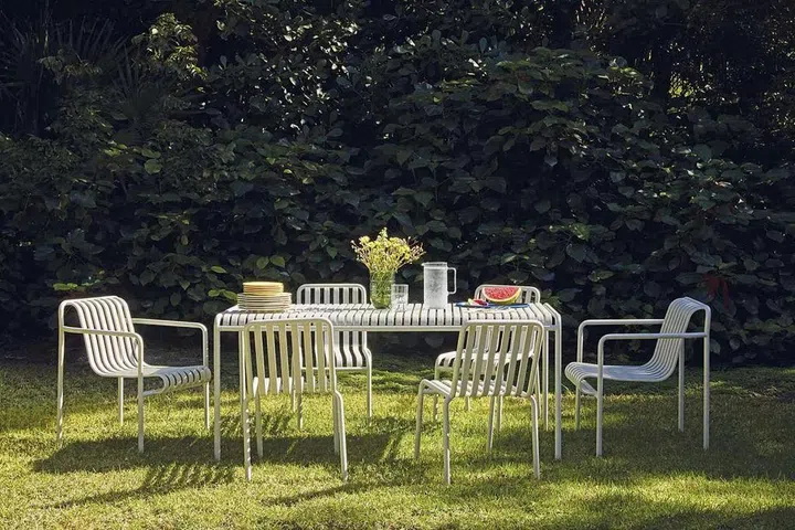 Inspired by the principle of symmetrical geometry, the HAY Palissade series was designed by French brothers Ronan and Erwan Bouroullec with a simple but visually strong aesthetic. The chairs and benches come in powder-coated steel, but are also available in a hot-dip galvanised finish for more durability.