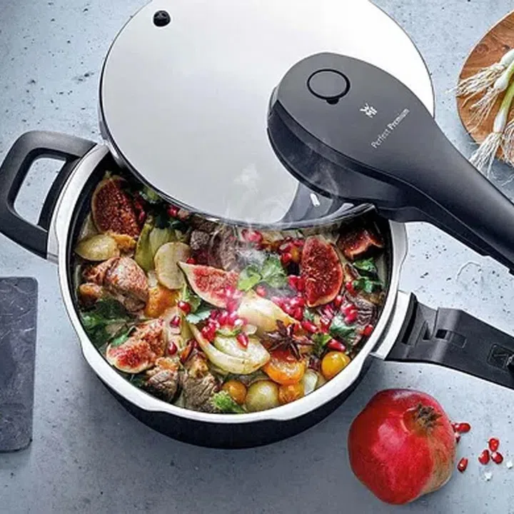 The WMF Perfect Premium Pressure Cooker promises this and more within its handsome heavy-gauge stainless steel chambers.