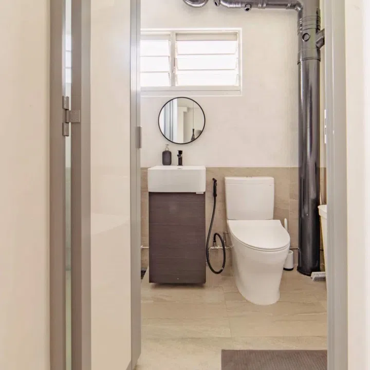 To keep the design congruent, the pipes were painted black, which went well with the black-rimmed mirror, and bathroom fittings too.