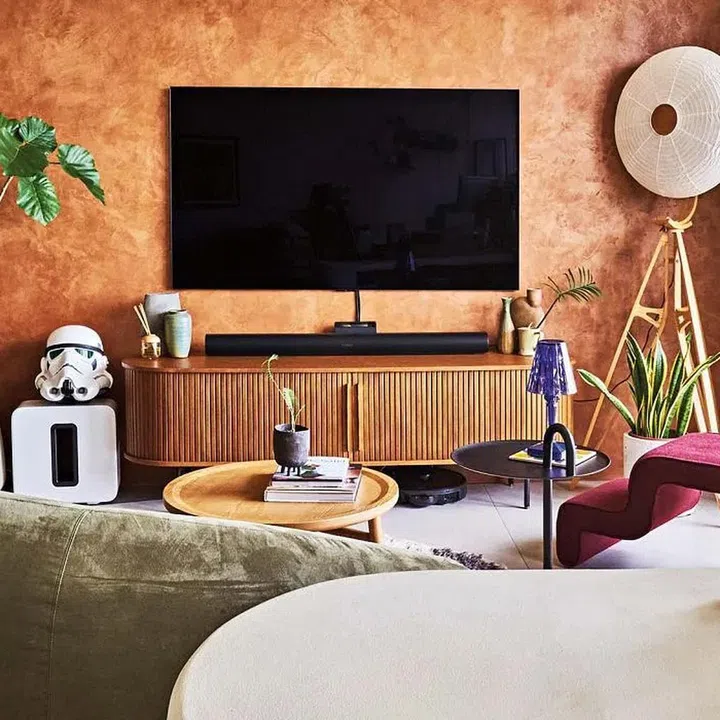 An open concept with terracotta hues and curved lines brings a welcoming warmth
