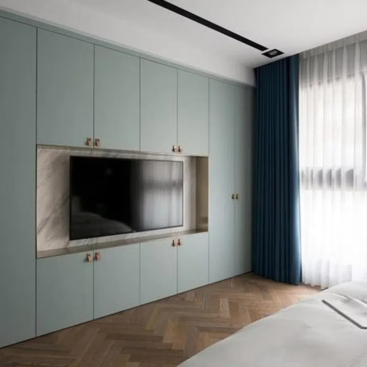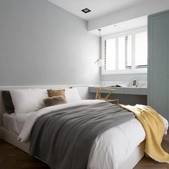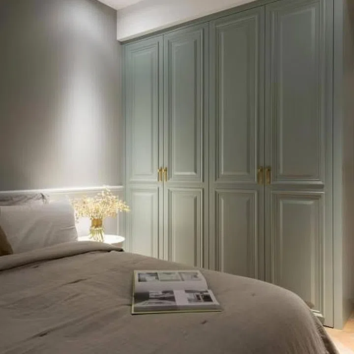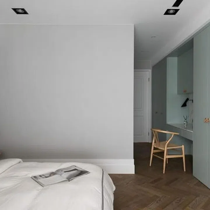 In the bedroom, the colours are kept soft, with details added in the cabinetry and the walls to create depth and character.
