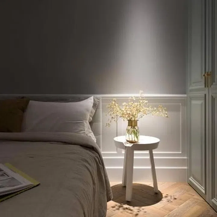 A downlight creates drama in one corner of the bedroom next to the wardrobe.