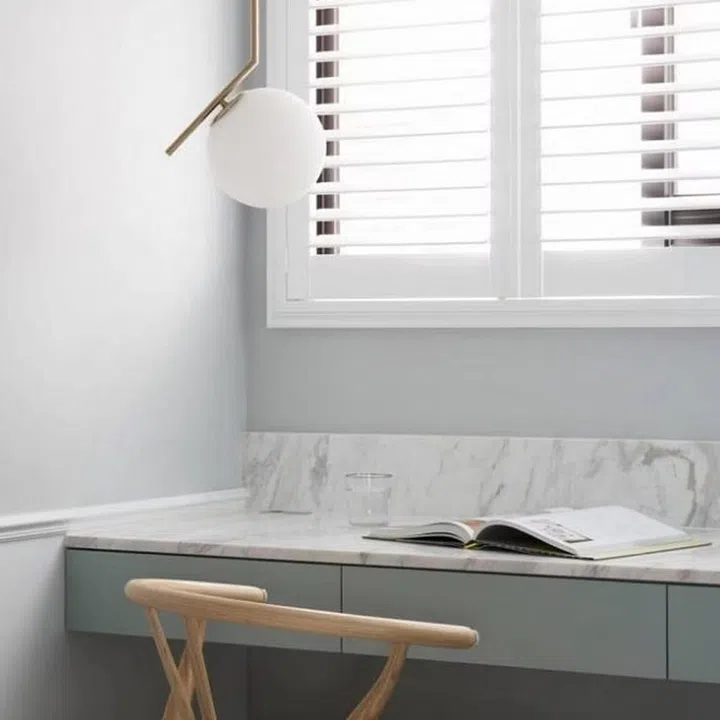 In the study corner, the same white marble is used to line the table top and wall.