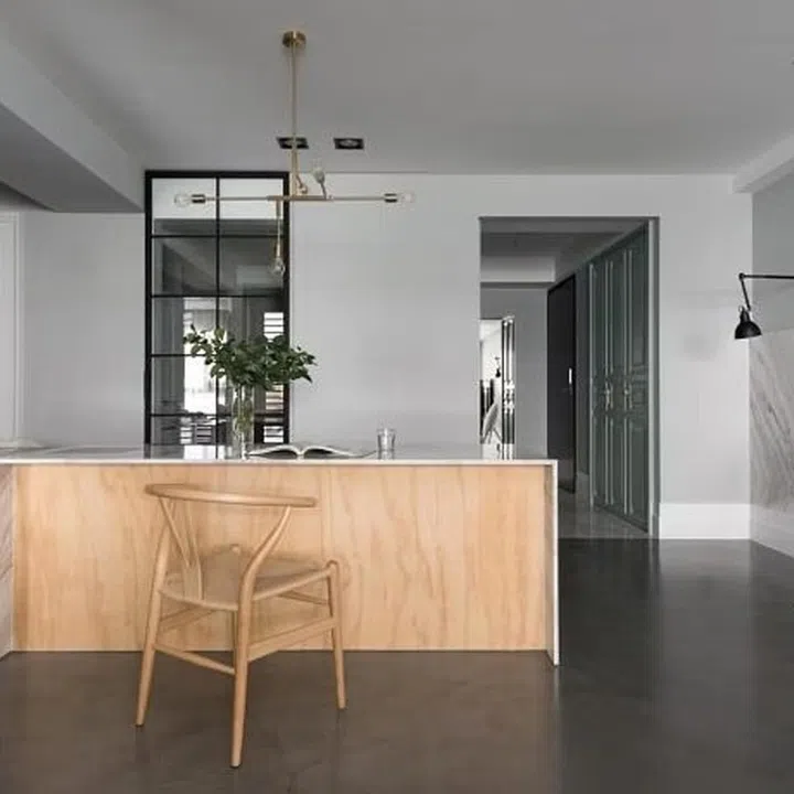 The slab-matched marble on the wall and the concrete-screed floors add a dash of contemporary elegance to the space.