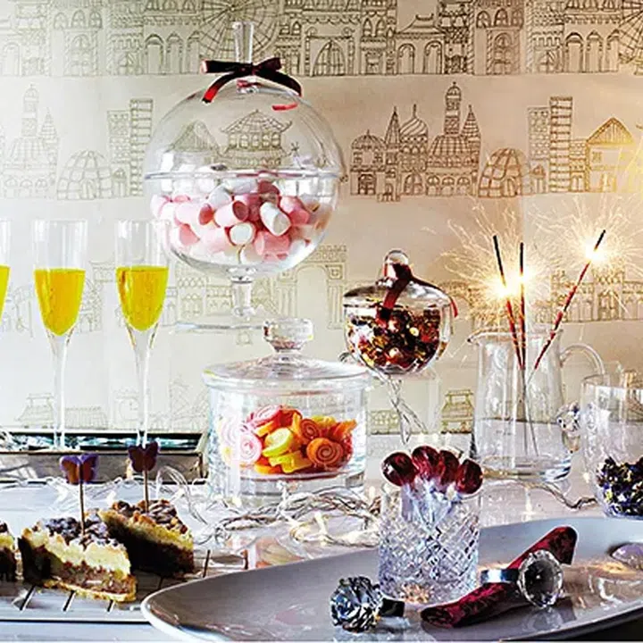 Consider working Christmas ornaments into your table setting like this star on the cake stand, or find utensils with patterns, colours, stars, and sparkles embedded on them. Fuss-free styling!