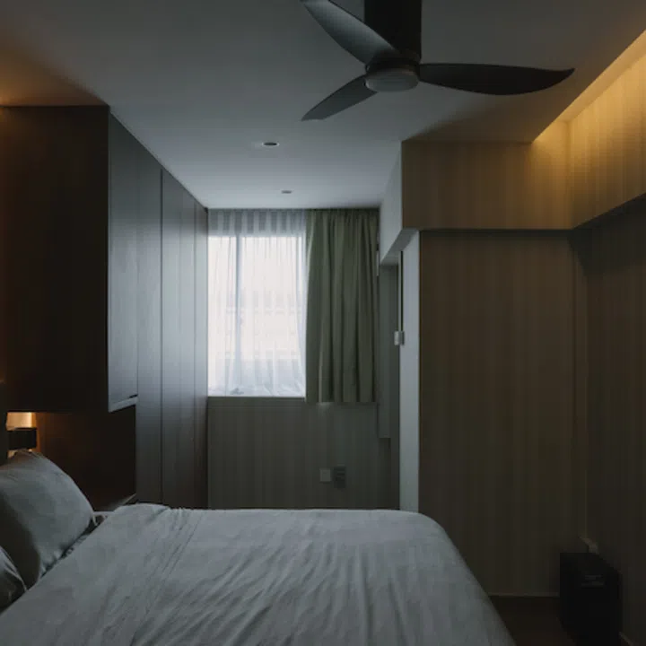 The master bedroom is relatively small and oddly shaped. In today’s trend, many IDs will propose to merge two rooms to increase the overall size and create a walk-in wardrobe. Since one room has already been converted to a dining area, I proposed to merge the master bedroom with the storeroom, which created space enough for the homeowners to accommodate a long stretch of wardrobe across the room, and to move about easily.