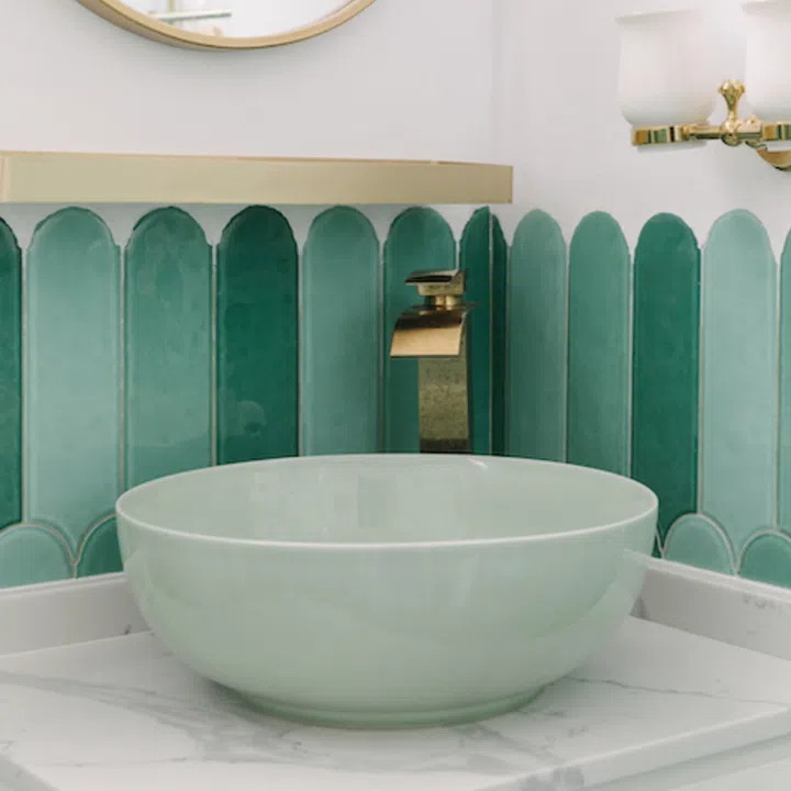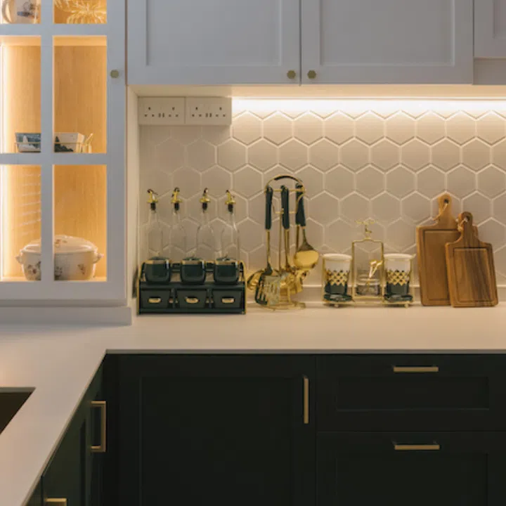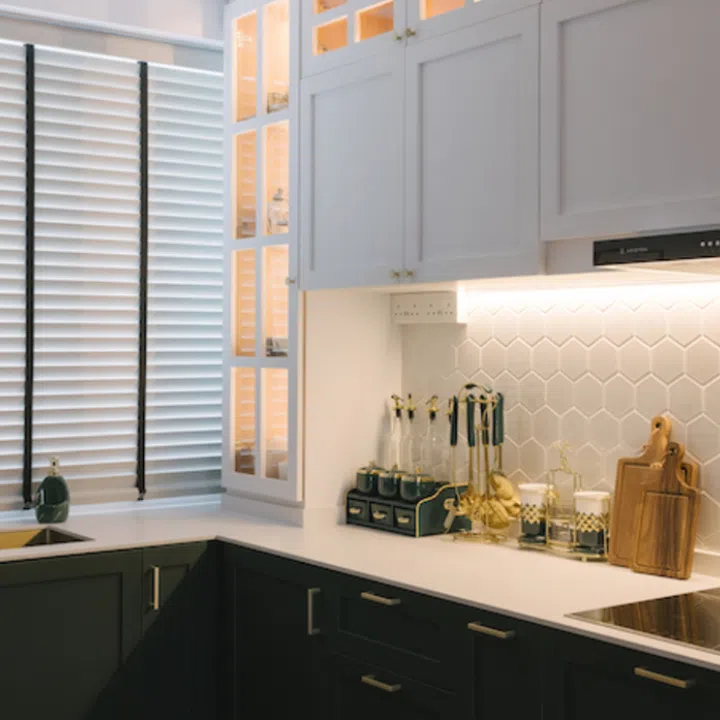 The kitchen cabinets were designed with a shaker profile to elevate the victorian element and the kitchen top cabinets were fabricated with the open-concept design to showcase a tint of the oak. To add to the atmosphere, the backsplash was styled with hexagon mosaic tiles.