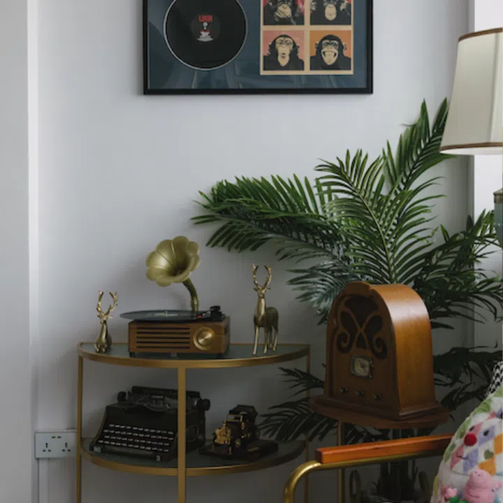 We converted the former balcony into a cosy nook brimming with vintage flair. The brushed brass metallic accents, complemented by the green plants, help to draw out the reminiscent feel of the colonial era.
