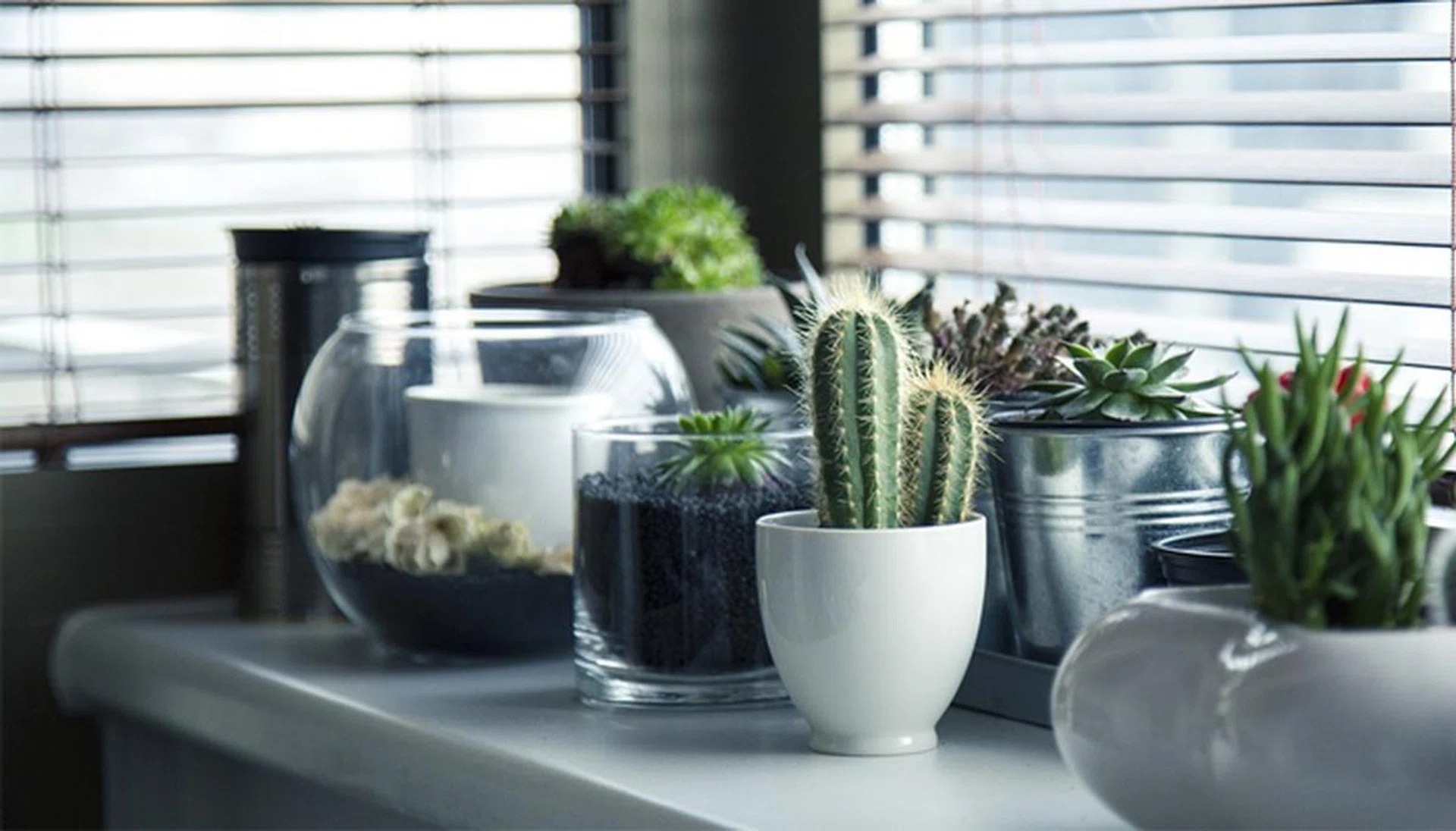 Consider succulents like cactus, which are easy to maintain, and place them in small plant pots on wall-mounted shelves at eye-level. These are also easy to pot, so be creative in their containers. Think dainty teacups and even egg cups for smaller plants.