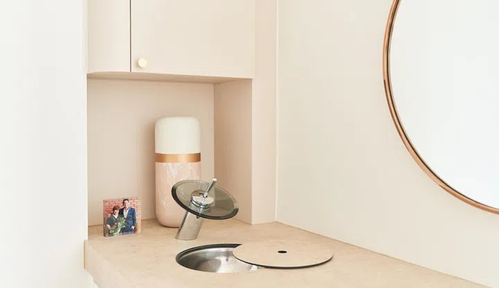 Another clever bit of detailing is the ironing board placed inside Aiken’s mum’s bedroom, a bright space with a decidedly softer and feminine space with touches of pastel pink. The ironing board is integrated into the wardrobe via a pull-out mechanism that can be easily slid inside when not needed, leaving the space tidy in a jiffy.