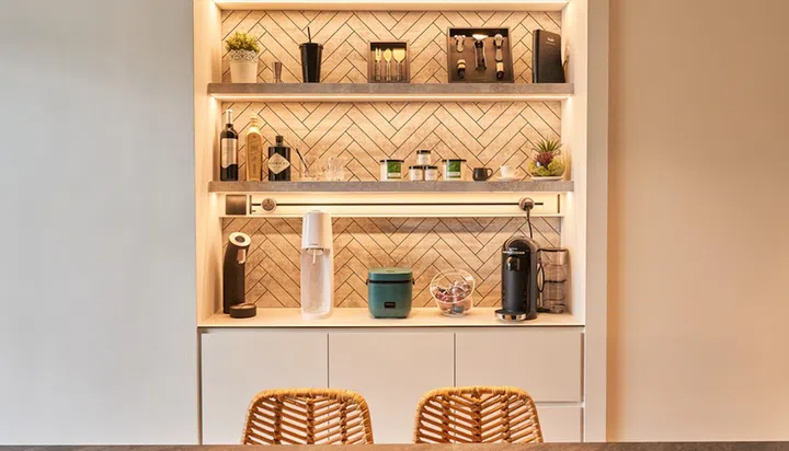 Now you see it, now you don’t. The smartest home technology appears when you need it and disappears when you don’t, leaving the space clean and uncluttered. Aiken has many of these installed throughout the house. Like the kitchen hob that pops out and in to the counter according to the chef’s needs.