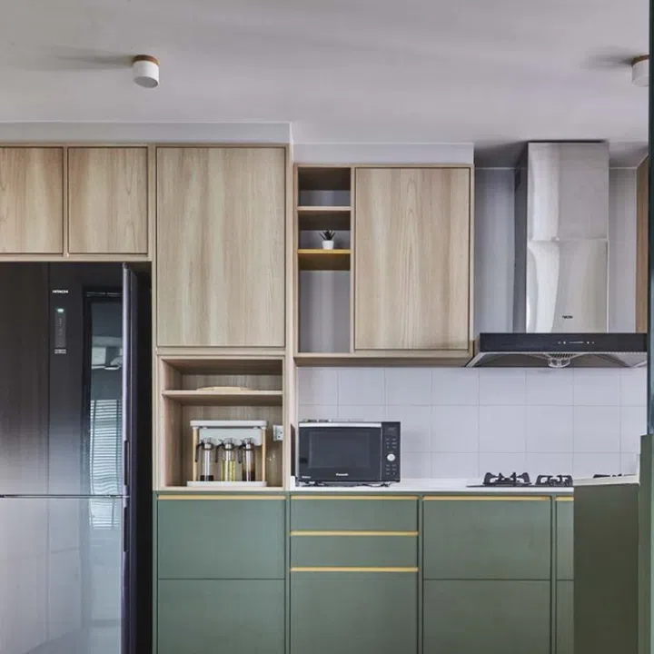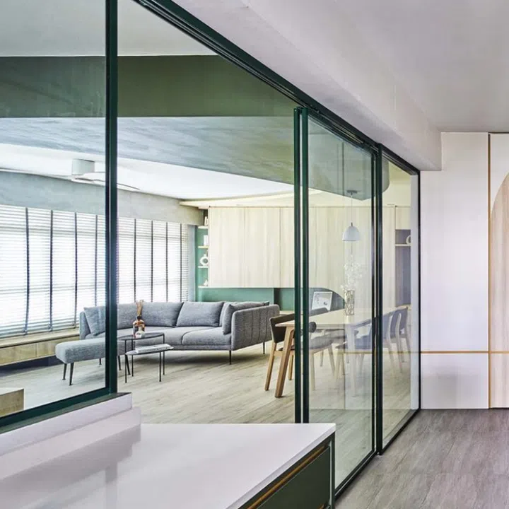 The green powder-coated sliding and fixed glass panels separating the semi-open kitchen from the dining area sync with the overall colour scheme.