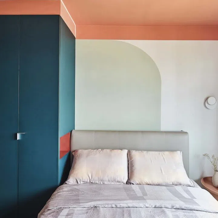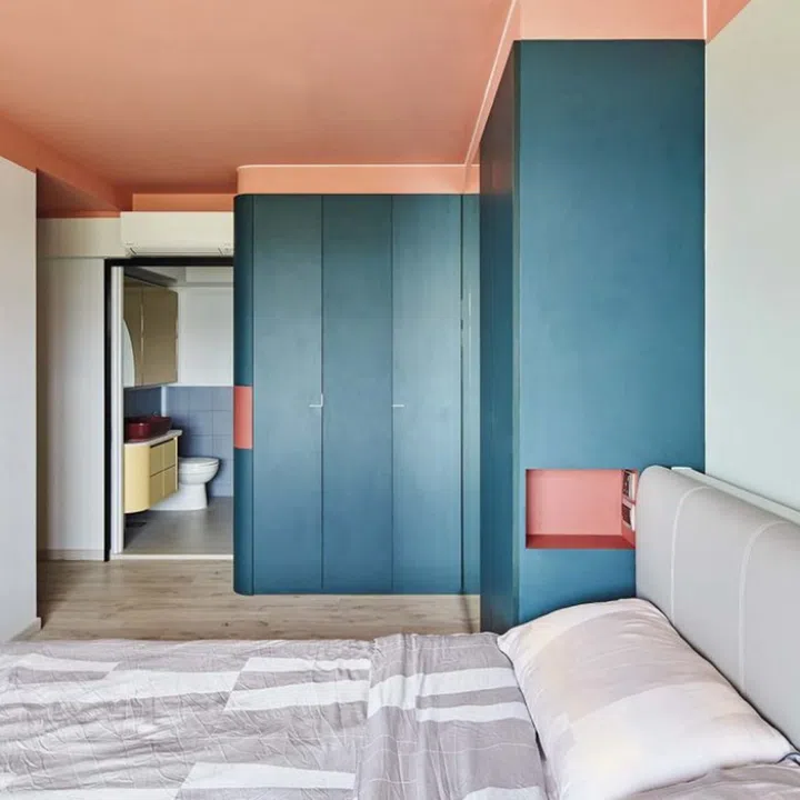 The bedroom introduces a bolder combination: bluish-green and coral on the built-in wardrobe and ceiling.