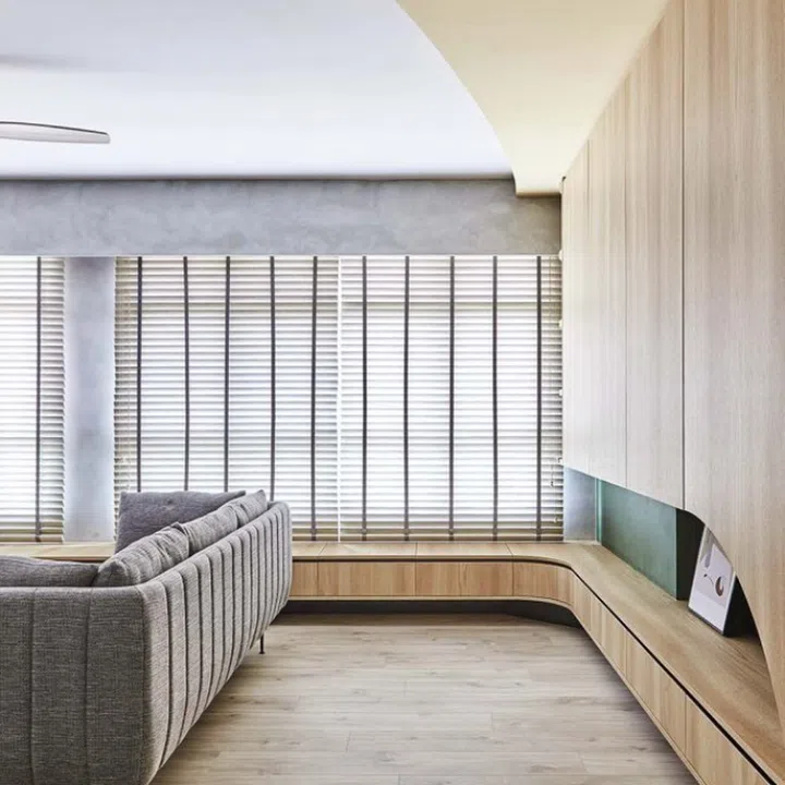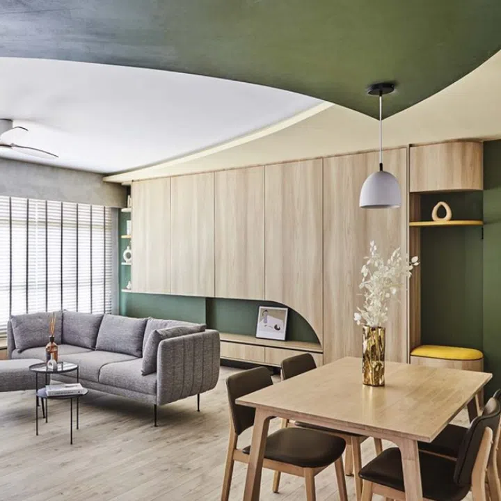Curved elements and contrasting colours give this HDB a unique, refreshing look somewhere between Scandinavian and industrial look