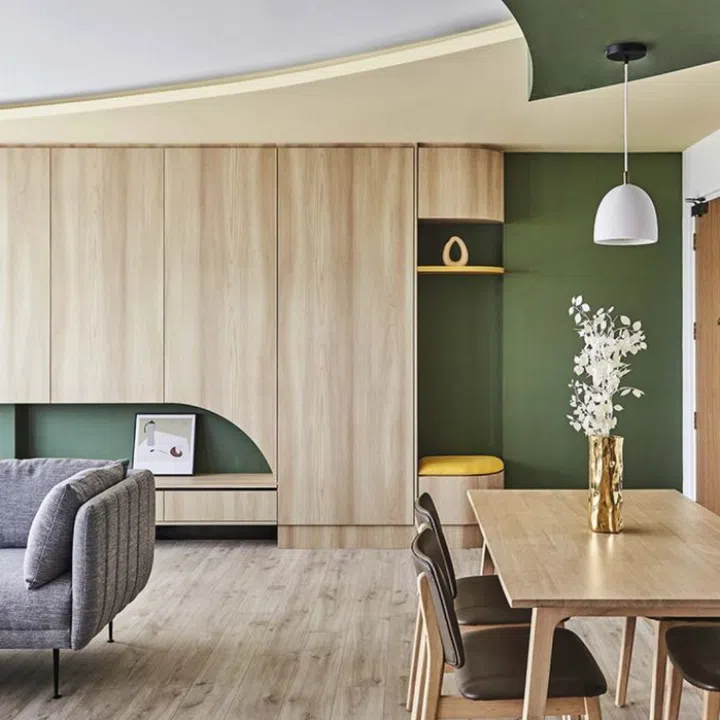 A small, circular, mustard-coloured seat at the entrance contrasts with the deep green wall, and it is part of a series of built-in cabinets and top-hinged storage compartments that continue along the living room’s back wall.