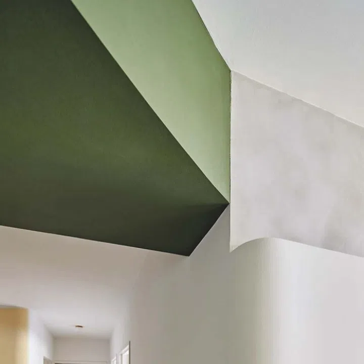 The light yellow, a similar shade of green as the living room wall, and the different heights of the ceiling add depth and contrast to the spaces.