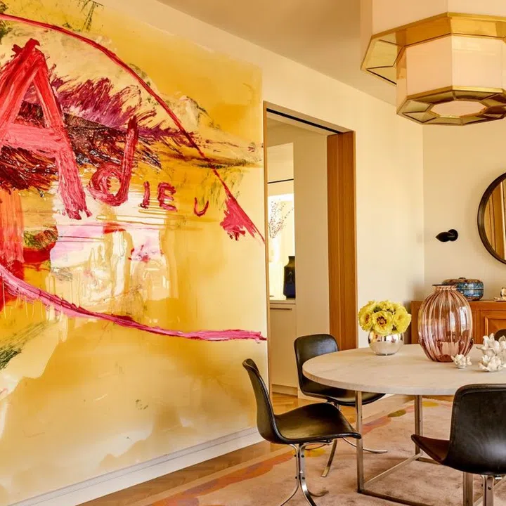 The Manhattan home of star racer Jimmie Johnson was designed by Shawn Henderson. The dining room features a showpiece by American painter and filmmaker, Julian Schnabel.
