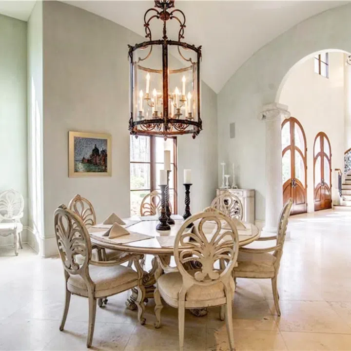 Rihanna’s beautiful dining room is fitted with cathedral-like arched windows and a hanging pendant light.