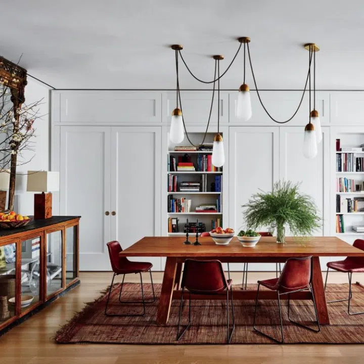 Vintage meets antique in Naomi Watts and Liev Schreiber’s Manhattan apartment. Lights by Apparatus Studio hang above a Ralph Lauren Home table and Sol y Luna chairs in the dining room.