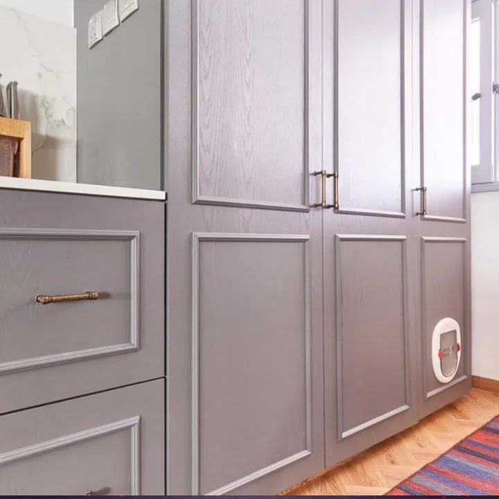 Cats love exploring hidden spaces, and in this home designed by 3D Conceptwerke, the litter box is placed inside the cabinet that the cat can access via a porthole. The hidden litter box also creates an overall cleaner look inside the home.