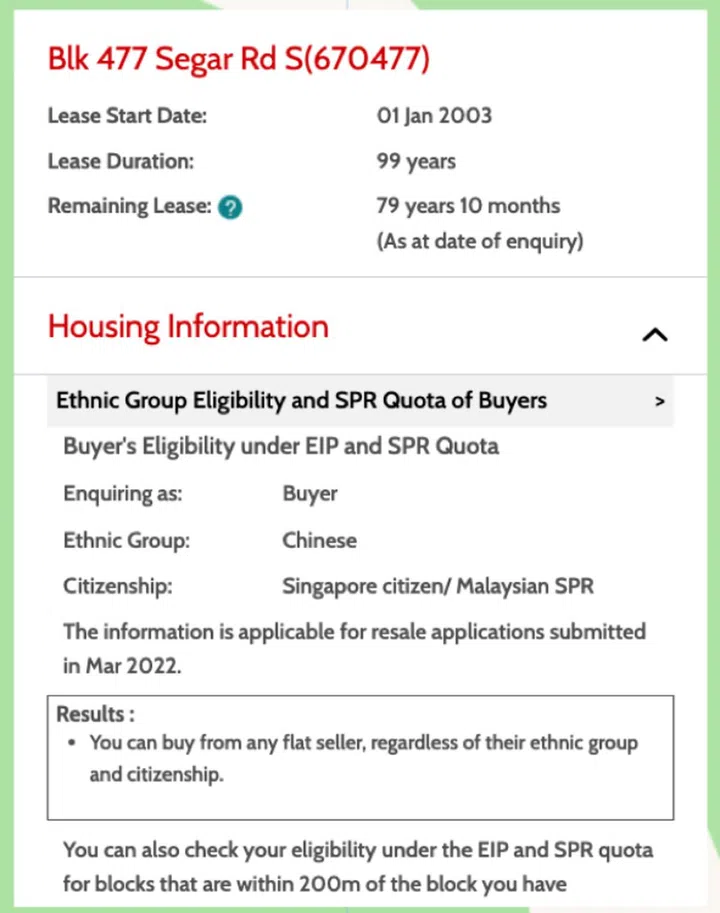 The Ethnic Group Quota is important, as you may not be eligible to buy if the quota is filled. You can see more details about the Ethnic Integration Policy here. Of course, this would depend on the seller too. For example, the Queenstown area is known to have a full Chinese quota, so as a Chinese, you won't be able to buy from any other race but yours. The ethnic quota is based on the block, not the development as a whole so be sure to check for each and every block even though it is very highly correlated.