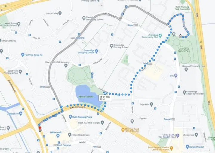 In fact, Google Maps often ignores routes that can be taken by parks or through other passageways that are not recognised as walking trails. For this, you could rely on a OneMap too as it comes with a navigation function. Here's a look at what the walking trail is like from 466 Segar Road to Bukit Panjang MRT on OneMap: