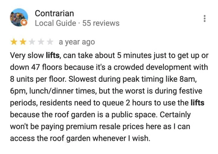 One way to check for this is to read Google reviews of the HDB development. If there’s anything people like to complain about, it’s having to wait, so if it really is an issue, Google Reviews would surface them: