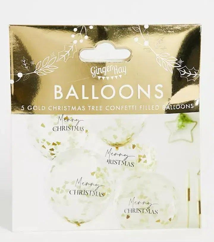 These aren't your average kiddy balloons — these clear ones with gold Christmas tree-shaped confetti will lend glamour to any celebration.