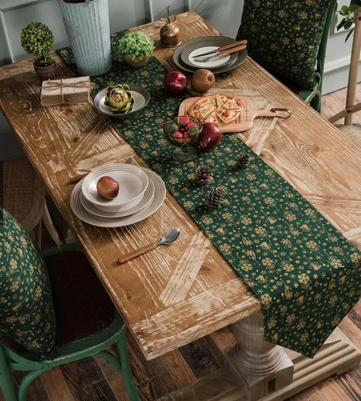 The easiest way to add holiday cheer to a dining table? A festive table runner. And this one with a dark green hue and intricate patterns evokes a sophisticated vibe.