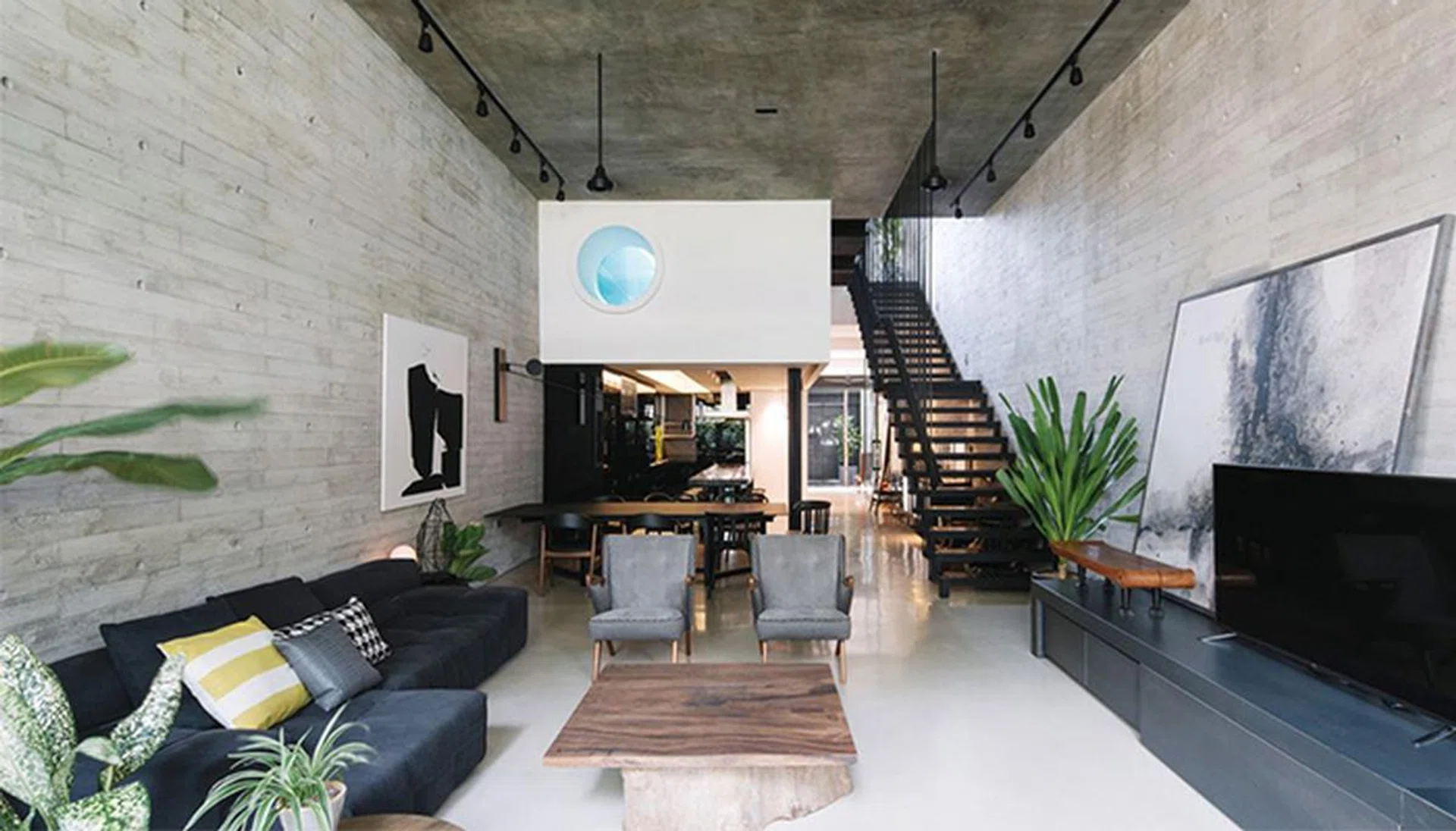 Located off the main road in suburban Siglap, this four-storey inter-terrace house doesn’t give away much at first glance. Through its perforated black ash wood and steel facade, you catch glimpses of foliage, hinting at the surprises within.