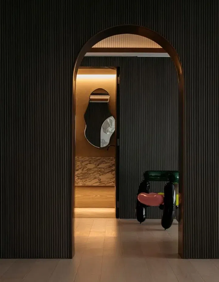 Special mention goes to the play area flanking the entrance foyer, accessible through an arched doorway — a feature repeated several times throughout the unit.