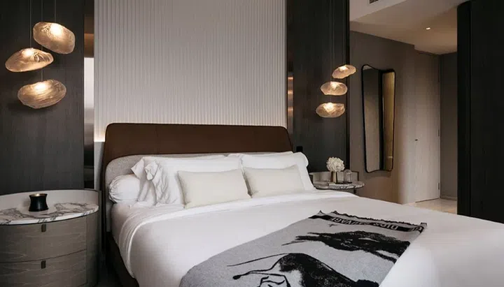 Unique pieces feature prominently in the bedrooms, too. The master bedroom has a pair of Bocci pendant lights hanging over the bedside table, while the bedframe is from Poltrona Frau.