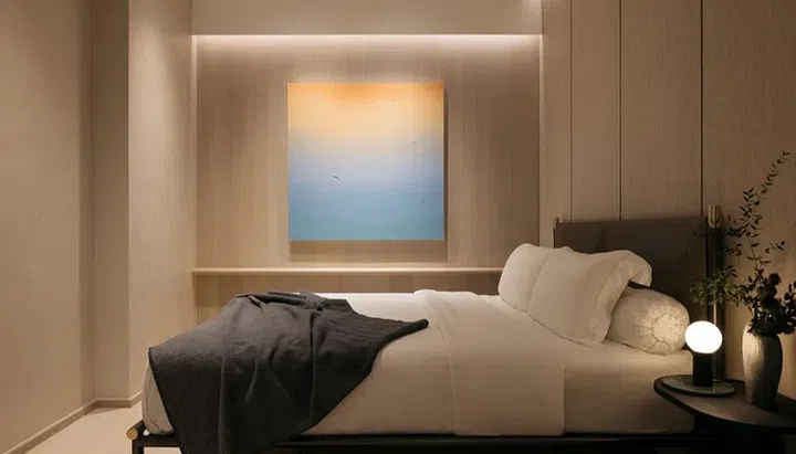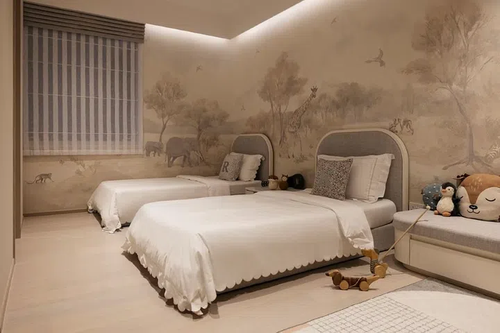 In the third bedroom, a commissioned painting by Singaporean artist Jamie Teo hangs on one wall. The young, award-winning artist was tasked with capturing part of the sky, since the room only has one window.
